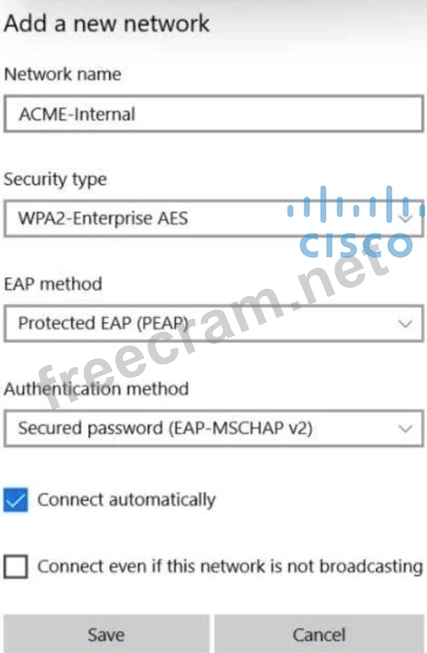 Refer to the exhibit. A company has an internal wireless network with a hidden SSID and RADIUS-based client authentication for increased security. An employee attempts to manually add the company network to a laptop, but the laptop does not attempt to connect to the network.