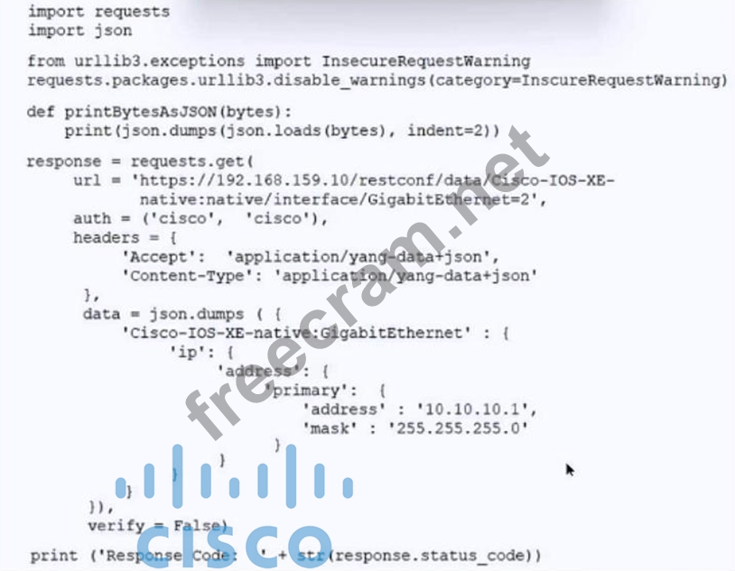 Refer to the exhibit. An engineer attempts to use RESTCONF to configure GigabitEthernet2 on a remote router with IP address 192.168.159.10, but the configuration fails. Which configuration is required to complete the action?