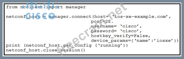 Refer to the exhibit. An engineer deploys a script to retrieve the running configuration from a NETCONF-capable Cisco IOS XE device that is configured with default settings. The script fails.