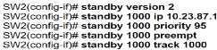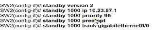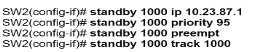 Refer to the exhibit. An engineer must configure HSRP for VLAN 1000 on SW2. The secondary switch must immediately take over the role of active router If the interlink with the primary switch fails. Which command set completes this task?