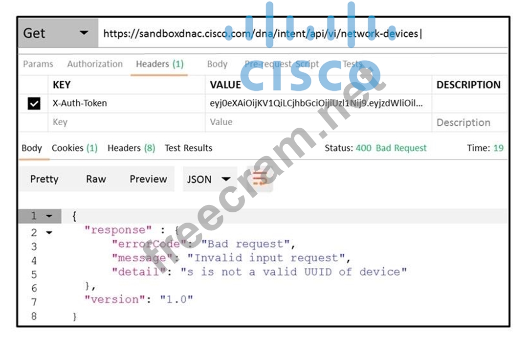 Refer to the exhibit. POSTMAN is showing an attempt to retrieve network device information from Cisco DNA Center API. What is the issue?
