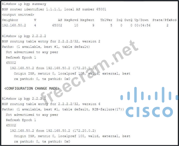 Question 595: Refer to the exhibit. An engineer configures the BGP adjacen...