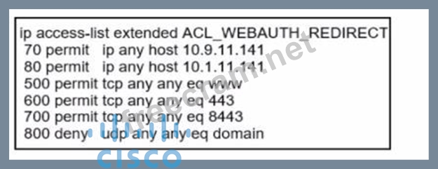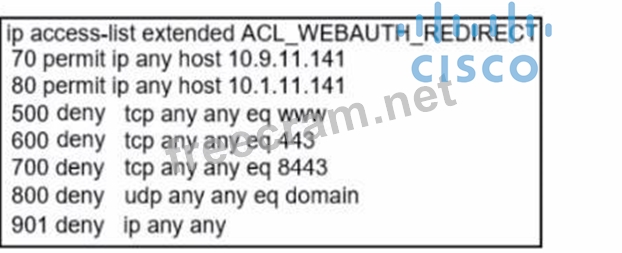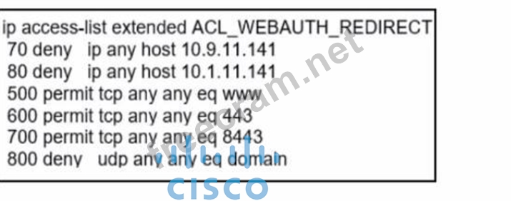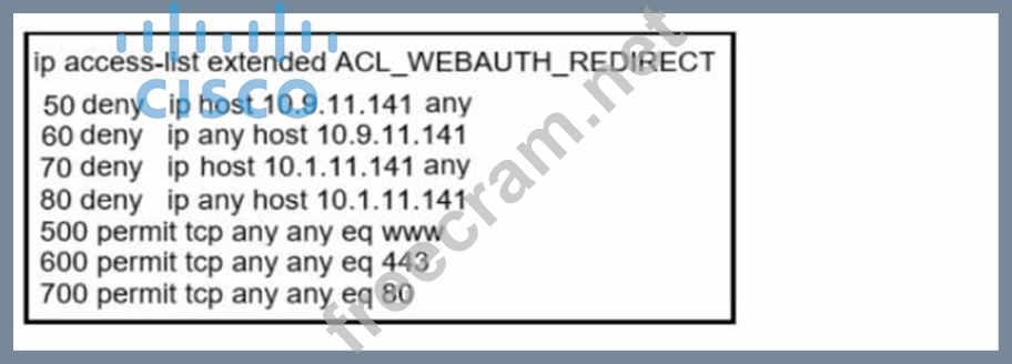 An engineer must construct an access list for a Cisco Catalyst 9800 Series WLC that will redirect wireless guest users to a splash page that is hosted on a Cisco ISE server. The Cisco ISE servers are hosted at 10.9.11.141 and 10.1.11.141. Which access list meets the requirements?