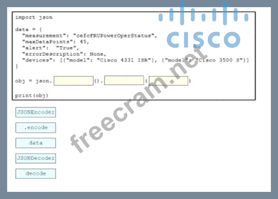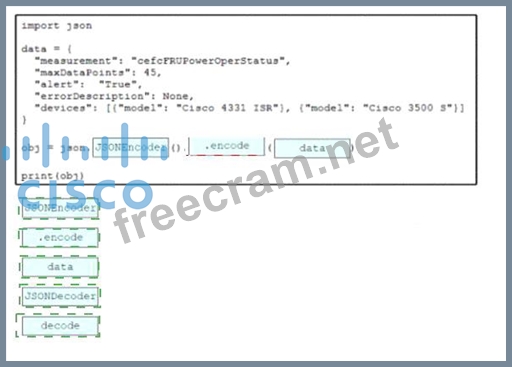 Drag and drop the code snippets from the bottom onto the blanks in the script to convert a Python object into a JSON string. Not all options are used