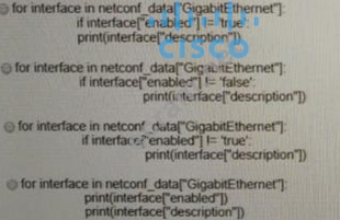 Refer to the exhibit. Which python code snippet prints the descriptions of disabled interface only?