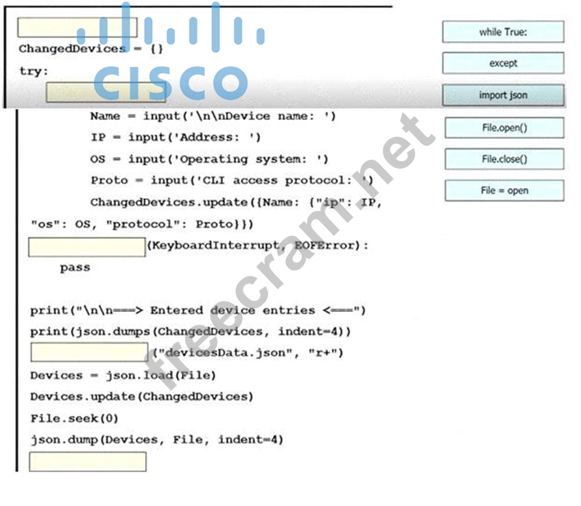 An engineer must create a script to append and modify device entries in a JSON-formatted file. The script must work as follows:
