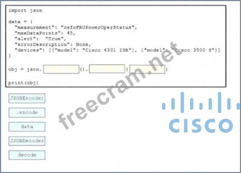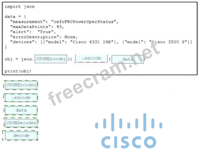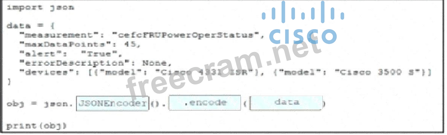 Drag and drop the code snippets from the bottom onto the blanks in the script to convert a Python object into a JSON string. Not all options are used