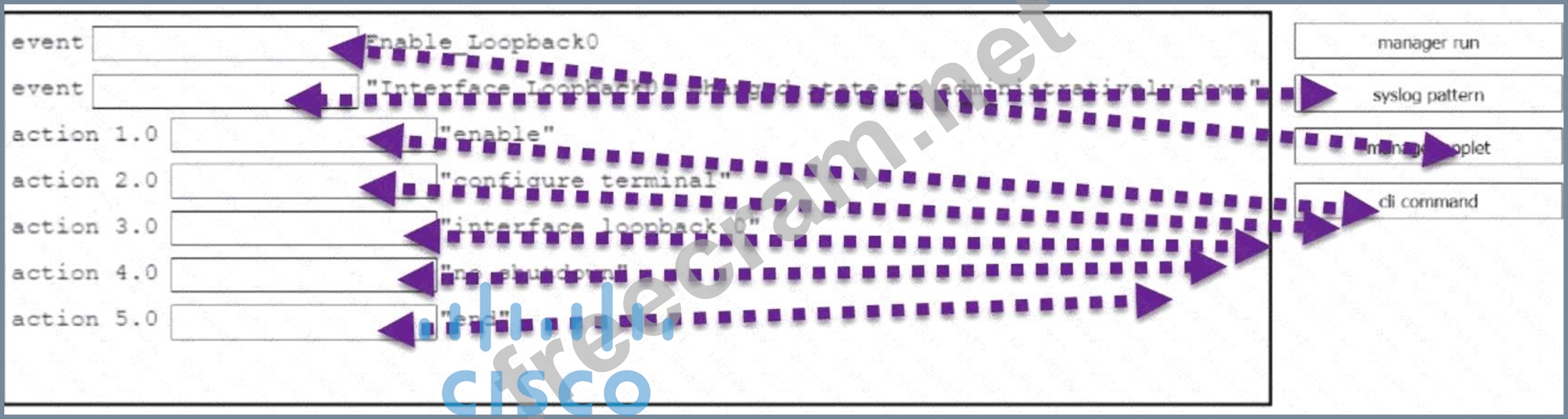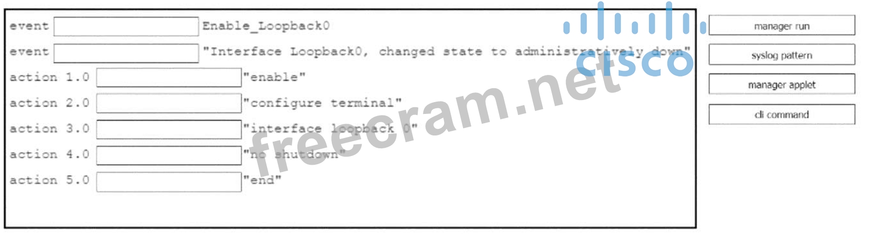 Drag and drop the command snippets from the right onto the boxes to create an EEM applet that will enable interface LoopbackO when the logging message 'Interface LoopbackO. changed state to administratively down" is received. Not all commands are used and some commands are used more than once.