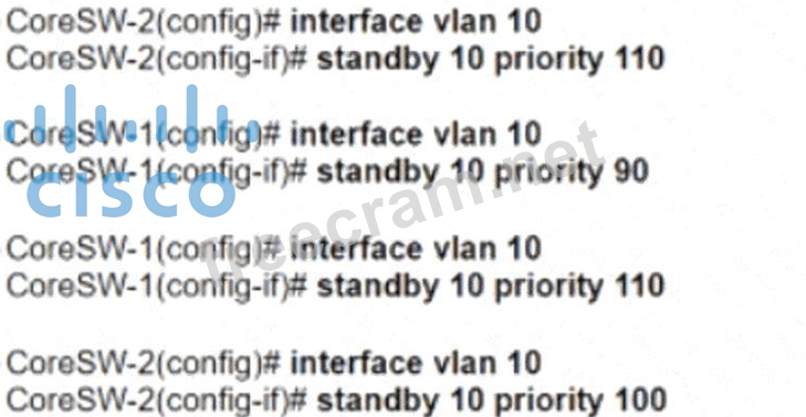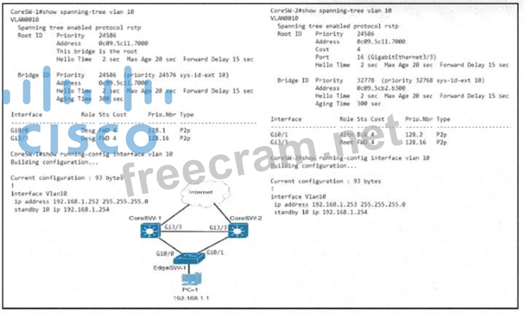 Refer to the exhibit. Which configuration causes the traffic from PC-1 to the internet to use the link between CoreSW-1 and CoreSW-2 when both switches are up?