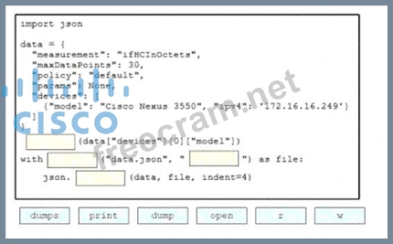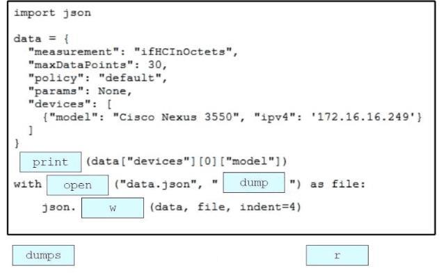 Drag and drop the code snippets from the bottom onto the blanks in the Python script to print the device model to the screen and write JSON data to a file. Not all options are used