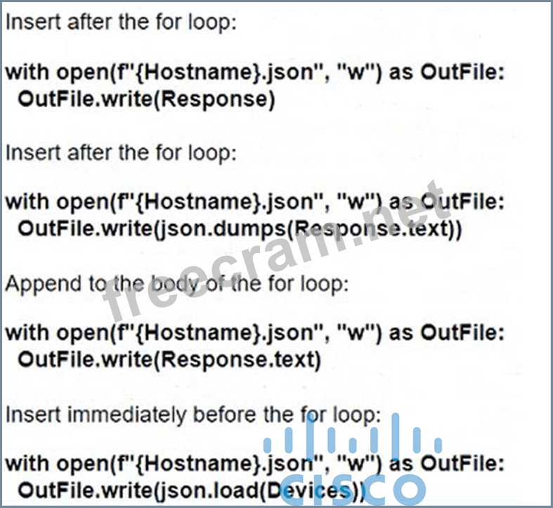 Refer to the exhibit. How should the script be completed so that each device configuration is saved into a JSON-formatted file under the device name?