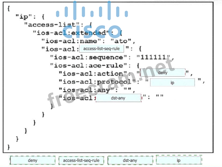 Drag and drop the code snippets from the bottom onto the blanks in the code to construct a request that configures a deny rule on an access list?