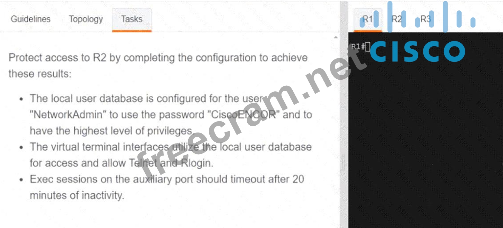 Question 43: Exhibit. (Exhibit) Security policy requires all idle-exec se...
