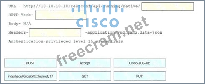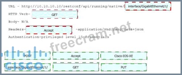 Refer to the exhibit. Drag and drop the snippets into the RESTCONF request to form the request that returns this response. Not all options are used.