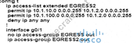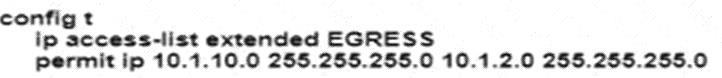 An engineer must modify the access control list EGRESS to allow all IP traffic from subnet 10.1.10.0/24 to 10.1.2.0/24.