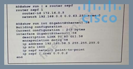 Which configuration must be implemented on router R8 so that it will establish OSPF adjacency with R5?