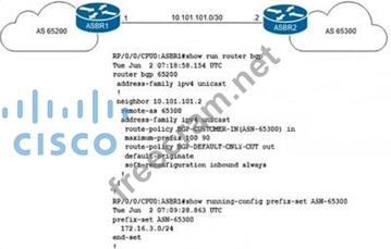 Which route policy must the engineer implement on ASBR1 to satisfy the requirements?