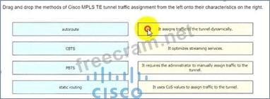 Drag and drop methods of Cisco MPLS tunnel traffic assignment from the left onto their characteristics on the right.