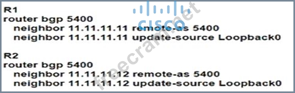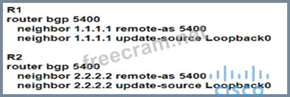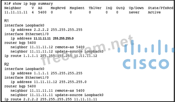 Router R1 is reporting that its BGP neighbor adjacency to router R2 is down, but its state is Active as shown. Which configuration must be applied to routers R1 and R2 to fix the problem?