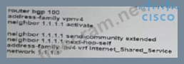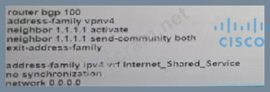 Refer to the exhibit. Which additional configuration must an engineer to the adge router to inject a default router into the MP-BGP address family for the internet_Shared_Services dedicated VRF?
