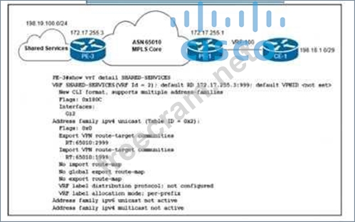 Which configuration must the engineer Apply to PE-1 to provision VRF-100 and provide access to the shared services?