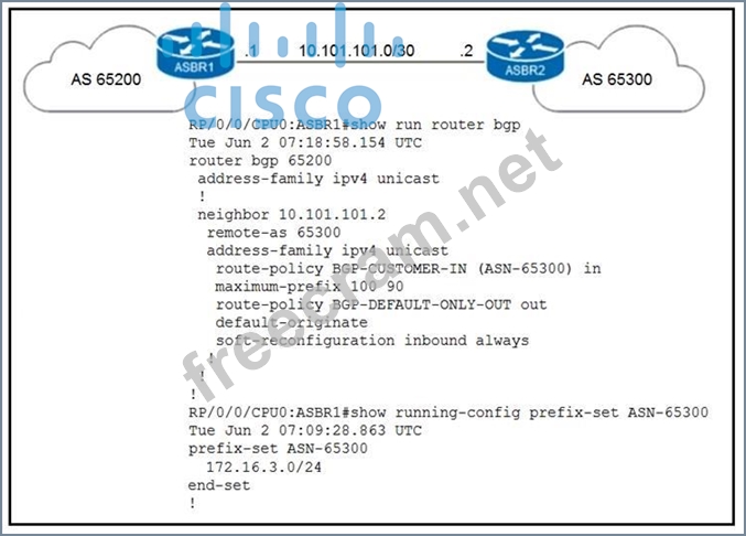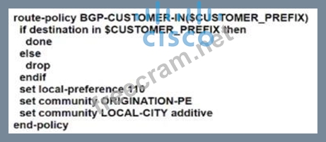 Refer to the exhibit.A network engineer is implementing a standard customer route-policy on ASBR1 with these requirements: