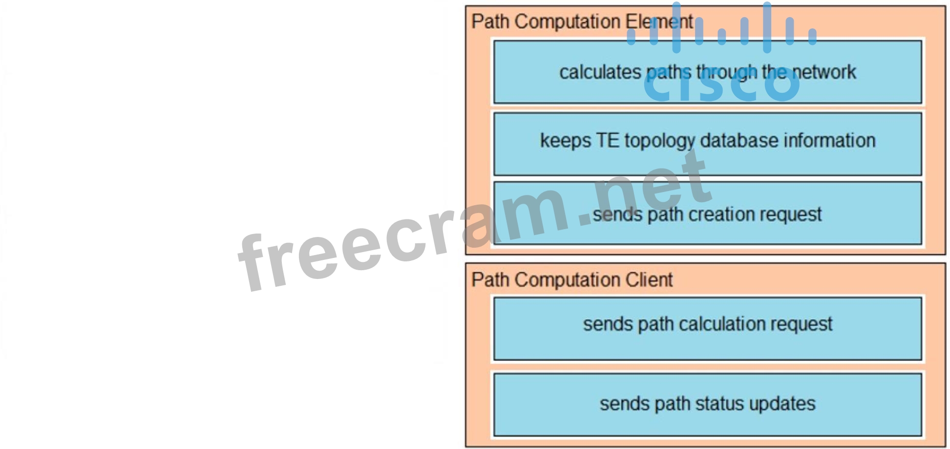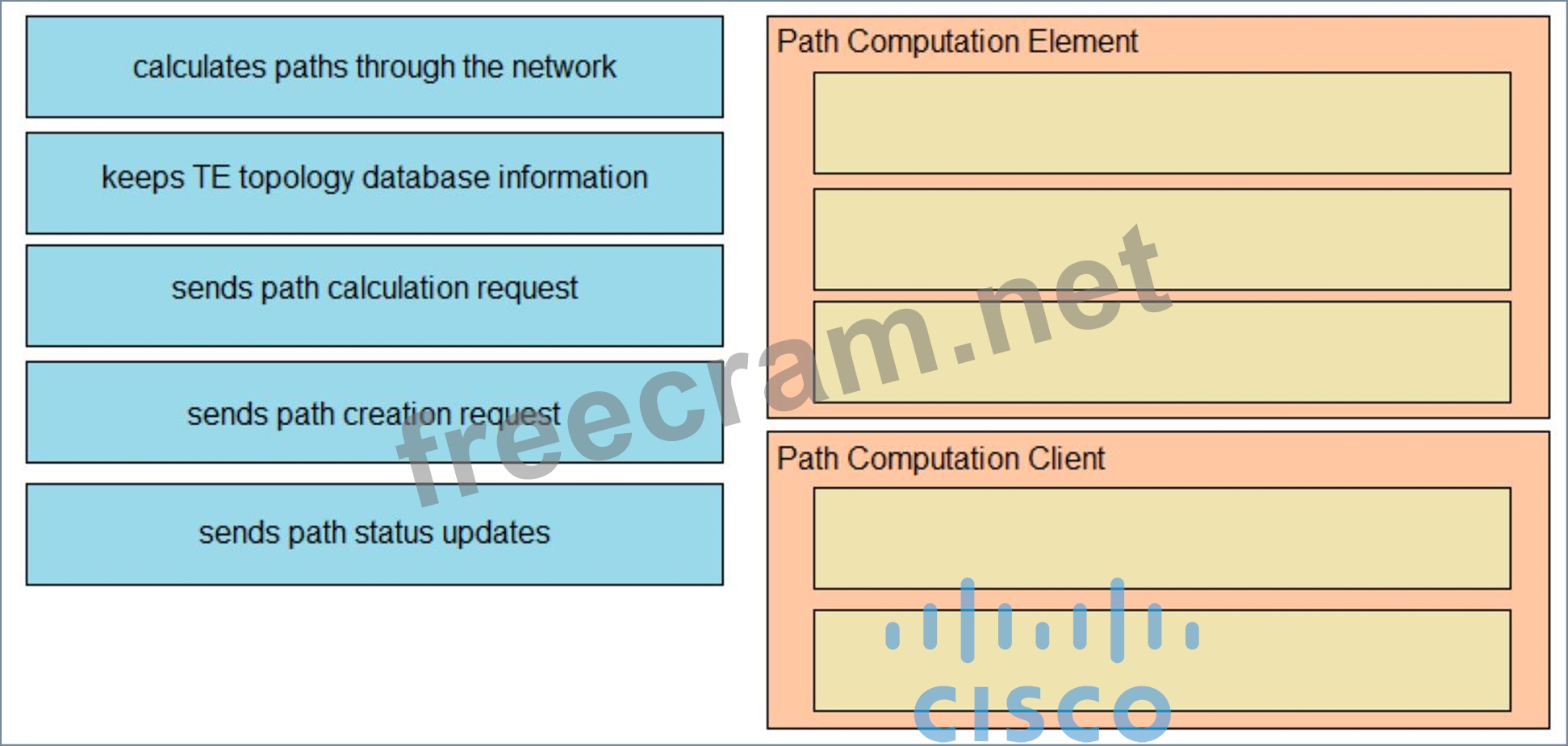 Drag and drop the functions from the left onto the correct Path Computation Element Protocol roles on the right.
