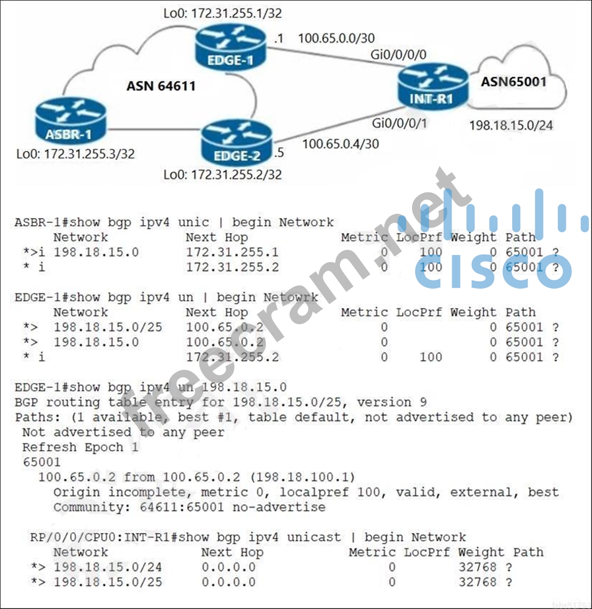 Refer to the exhibit. The network engineer who manages ASN 65001 is troubleshooting suboptimal routing to the 198.18.15.0/24 prefix. According to the network requirements: