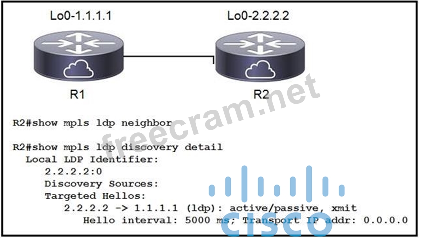 Refer to the exhibit. When implementing an LDP protocol, an engineer experienced an issue between two directly connected routers and noticed that no LDP neighbor exists for 1.1.1.1.
