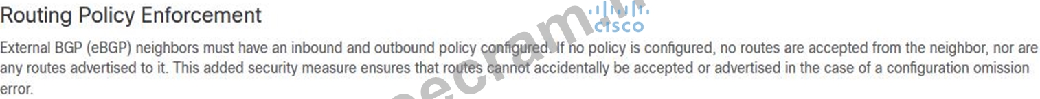 A remote operation center is deploying a set of l-BGP and E-BGP connections for multiple IOS-XR platforms using the same template. The l-BGP sessions exchange prefixes with no apparent issues, but the E-BGP sessions do not exchange routes. What causes this issue?