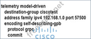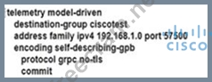 The configuration in Option A is correct for enabling dial-out telemetry streams using gRPC on devices with TLS disabled. It uses model-driven telemetry (MDT), which is a new method of monitoring network devices. Unlike traditional methods that pull data from the device, MDT pushes data from the device to the collector. In this configuration: Telemetry is model-driven. It specifies a destination group with an IP address and port number where the telemetry data will be sent. The encoding is self-describing-gpb (Google Protocol Buffers). The protocol used is TCP. This setup ensures that telemetry data is sent to the specified collector without requiring TLS encryption.