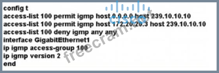Option A corresponds to the desired configuration. It uses an access-list to permit IGMP joins for the specific multicast group 239.10.10.10 from the source 172.20.20.3. Options B, C, and D do not match the desired configuration. They either allow all IGMP traffic or do not specify the correct source and group addresses.