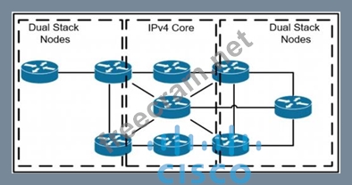 Refer to the exhibit. A network operator has two IPv4 and IPv6 dual-stacked network on each side of the IPv4 core network. The operator must be able to provide connectivity between them while using specific assigned IPv6 space provided from the company IP administrator team. Which technology should the network operator use to accomplish this goal?