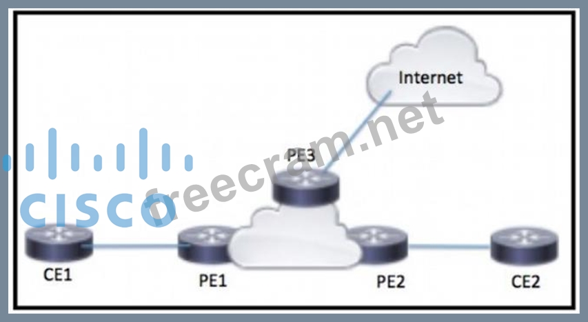 CE1 and CE2 require connectivity to the internet through the ISP connected to PE3 What should an engineer configure to complete this task?