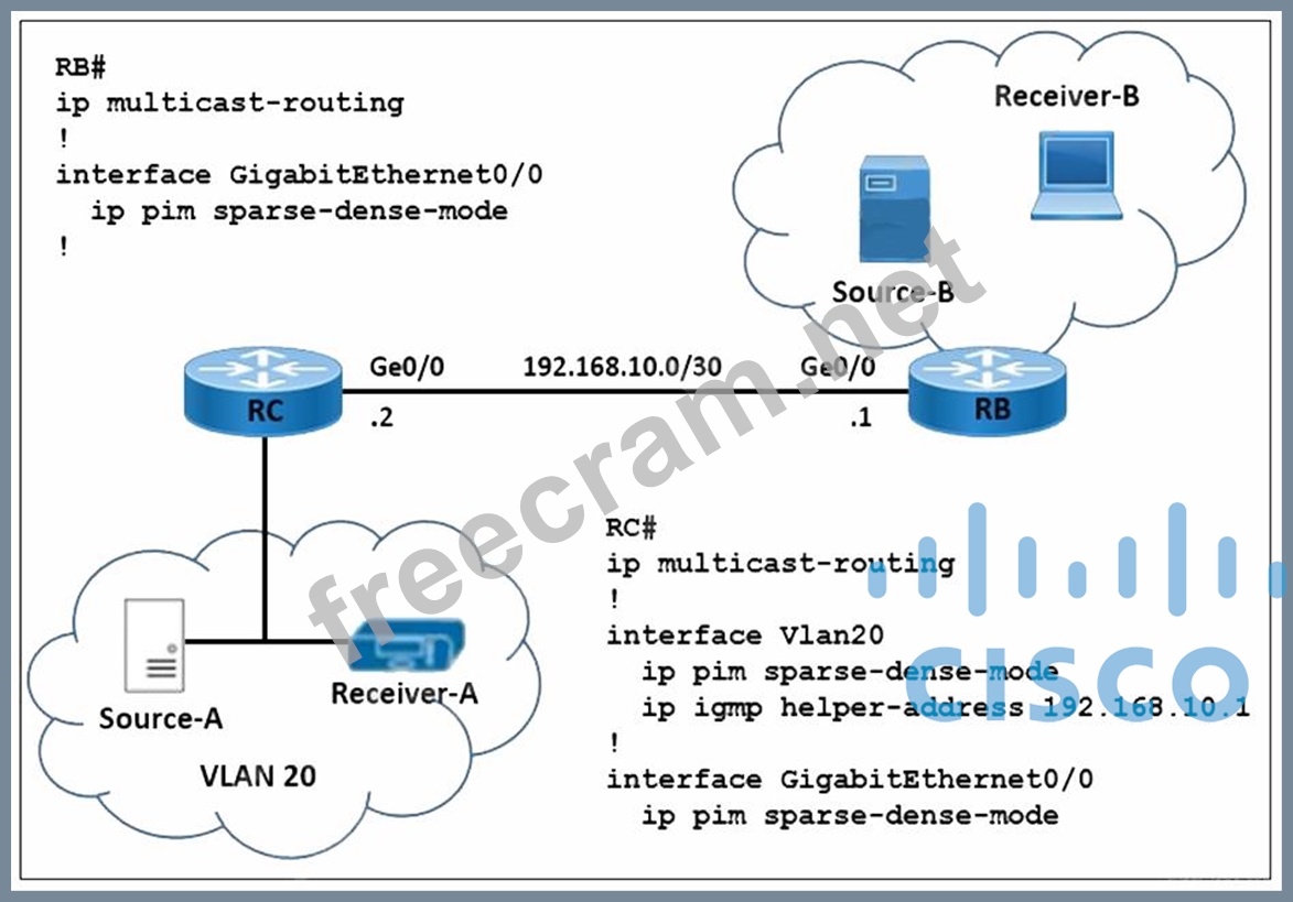 Refer to the exhibit. A network engineer is implementing multicast Source-A to send a multicast stream for Receiver-A, and multicast Source-B to send a multicast stream for Receiver-B. Router RC forwards the IGMP host a report and leaves messages to IP address 192.168.10.1. How must the multicast features be implemented to prevent RB from receiving multicast flooding from Source-A?