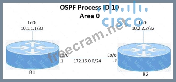 1. Establish R1 and R2 OSPF adjacency. All interfaces must be advertised in OSPF by using the OSPF interface command method. Use Loopback0 as the OSPF ID.