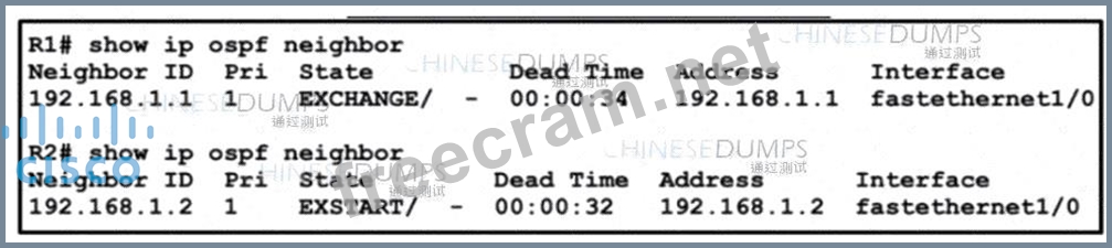 Refer to the exhibit. A company recently deployed a new network using OSPF in the core to share routes. The network administrator selected OSPF as the routing protocol because of its ability to maintain a route database. When the new network was started up, all routers booted normally, but the link between routers R1 and R2 failed to come up. The two routers are located in the same rack at the data center. Which task should an engineer perform to correct the problem?
