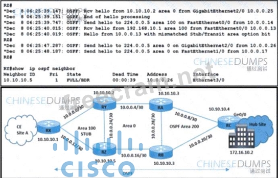 Refer to the exhibit. A network engineer received a complaint about these problems in OSPF stub area 100: * The Ethernet link is down between routers RX and RY because the fiber was cut. * CE site A traffic to the hub site is being dropped. Which action resolves these issues?