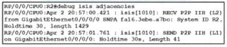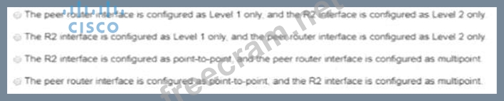 The issue with establishing an IS-IS adjacency between the two routers stems from a mismatch in the configuration of their interfaces. Router R2's interface is set to point-to-point, while the peer router interface is set to multipoint. For IS-IS adjacencies to form, both interfaces must be configured with the same network type. The discrepancy in the network types is preventing the adjacency from being established. To resolve this, the network operator must ensure that both interfaces are either configured as point-to-point or as multipoint. References := Implementing and Operating Cisco Service Provider Network Core Technologies (SPCOR)