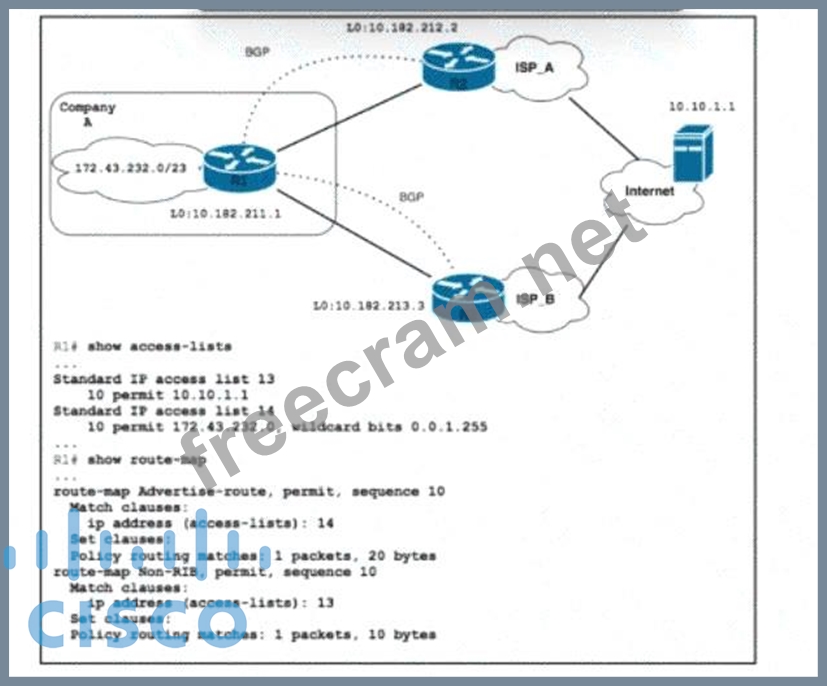 Refer to the exhibit. Company A is connected to multiple upstream ISPs, with ISP_A serving as the primary upstream ISP. The company A subnet 172.43.232.0 should be announced to the secondary ISP_B only when the FTP server with IP address 10.10.1.1 is not accessible via the primary ISP. Which configuration must be applied on R1?