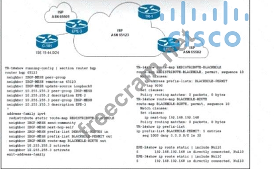 Refer to the exhibit. Customer C-101 in ASN 65123 requested that the ISP blackholes a host route