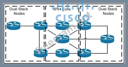 Refer to the exhibit. A network operator has two IPv4 and IPv6 dual-stacked network on each side of the IPv4 core network. The operator must be able to provide connectivity between them while using specific assigned IPv6 space provided from the company IP administrator team. Which technology should the network operator use to accomplish this goal?