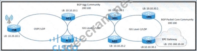 A NOC engineer is configuring label-based forwarding from CSR to the EPC gateway. Cell-site operation and maintenance for IPv4 traffic between 10.20.10.1 and 192.168.10.10 is already up. CR1 and CR2 are configured as route reflectors for AG1 and AG2. Which action completes the configuration?