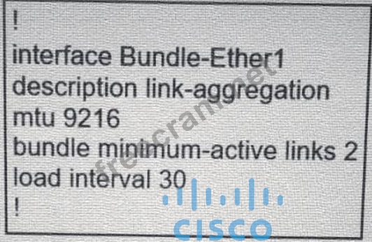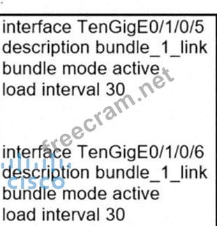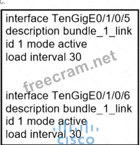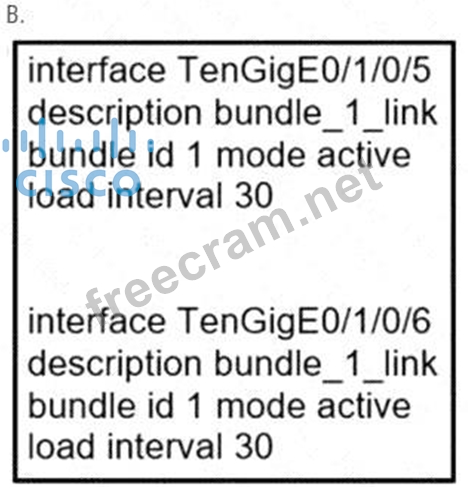 In the context of Cisco IOS XR software, the configuration under Option D is appropriate for adding an interface to a bundle using LACP (Link Aggregation Control Protocol). The configuration specifies two Ten Gigabit Ethernet interfaces (TenGigE0/1/0/5 and TenGigE0/1/0/6) with descriptions indicating they are part of "bundle_1_link". Both interfaces are assigned to "bundle id 1" with a load interval of 30 seconds, ensuring they are part of the same link aggregation group and share traffic load.