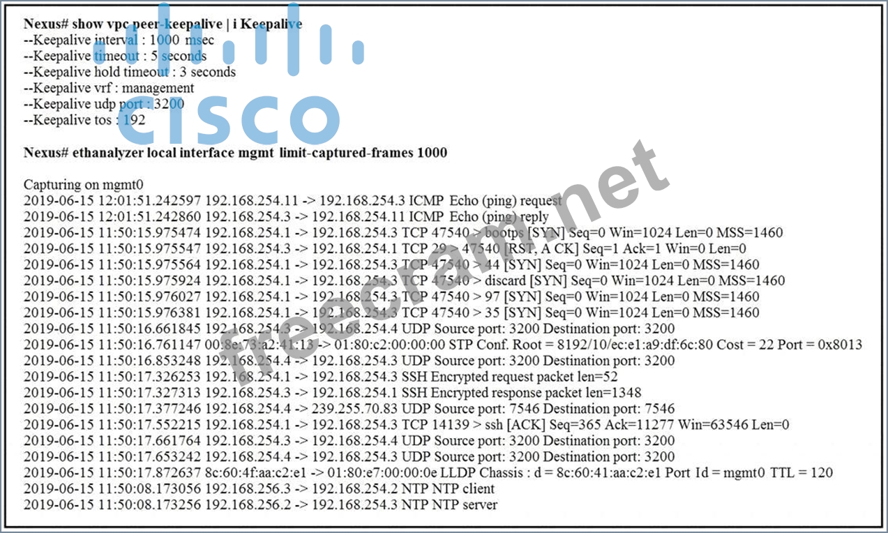 Refer to the exhibit. A flapping link issue has been reported on the vPC keepalive link. A packet capture has been activated on the Cisco Nexus switch. What is the destination IP address of the vPC keepalive packets that are sent by the switch?