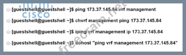 An engineer installed a new Nexus switch with the mgm0interface in vrf management. Connectivity to the rest of the network needs to be tested from the guest shell of the NX-OS. Which command tests connectivity from the shell of the NX-OS?