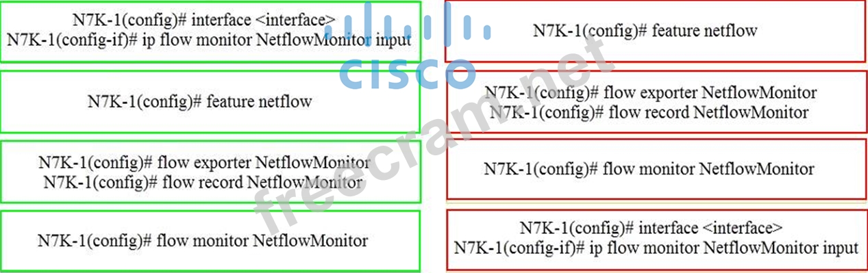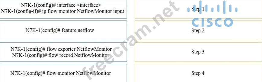 An engineer is implementing NetFlow on a Cisco Nexus 7000 Series Switch. Drag and drop the NetFlow commands from the left into the correct order they must be entered on the right.