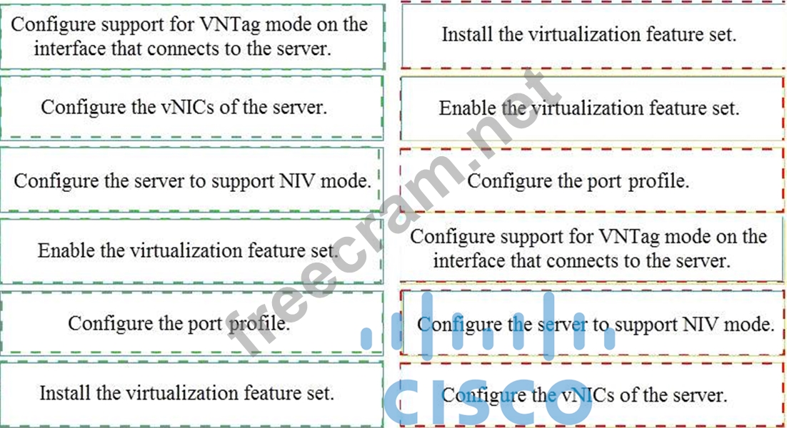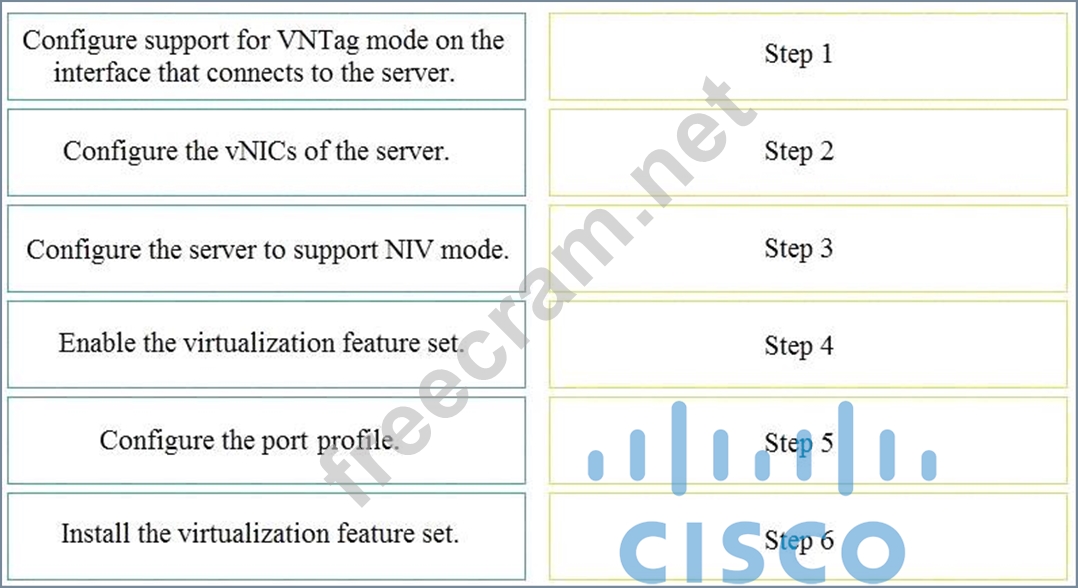 An engineer is configuring VNTag between a virtualized server and a Cisco Nexus 5500 Series switch. Drag and drop the configuration steps from the into the correct order on the right.