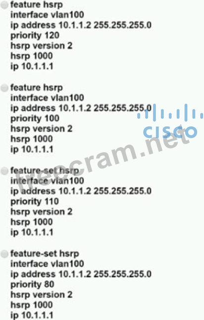 An engineer must configure a Nexus 7000 series switch for HSRP on VLAN 100. When fully functional, the router must be the active master. Which set of commands must be used to implement the scenario?