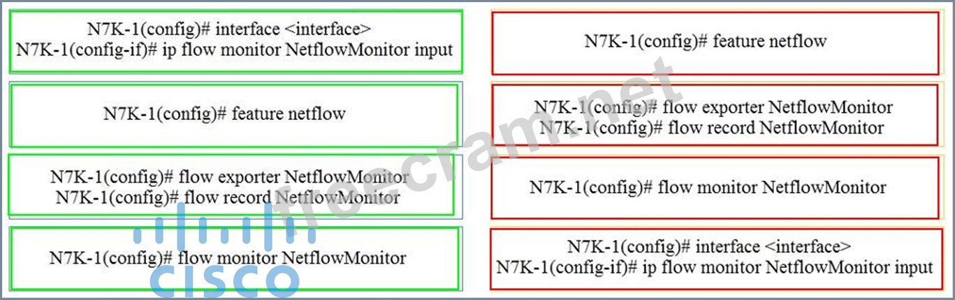 An engineer is implementing NetFlow on a Cisco Nexus 7000 Series Switch. Drag and drop the NetFlow commands from the left into the correct order they must be entered on the right.